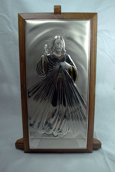 Silver plaque on Wood.On stand/ or as wall pendant.